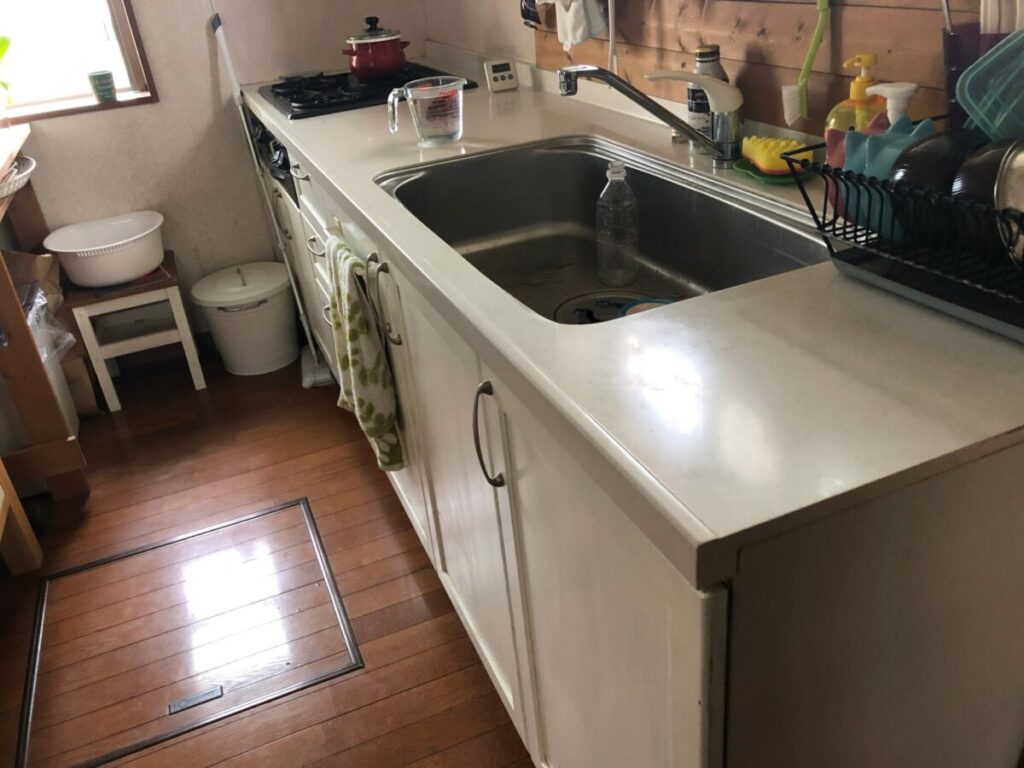 施工前のキッチンは、経年劣化により扉や収納部分の傷みが目立ち、使い勝手にも不便さが出ていました。