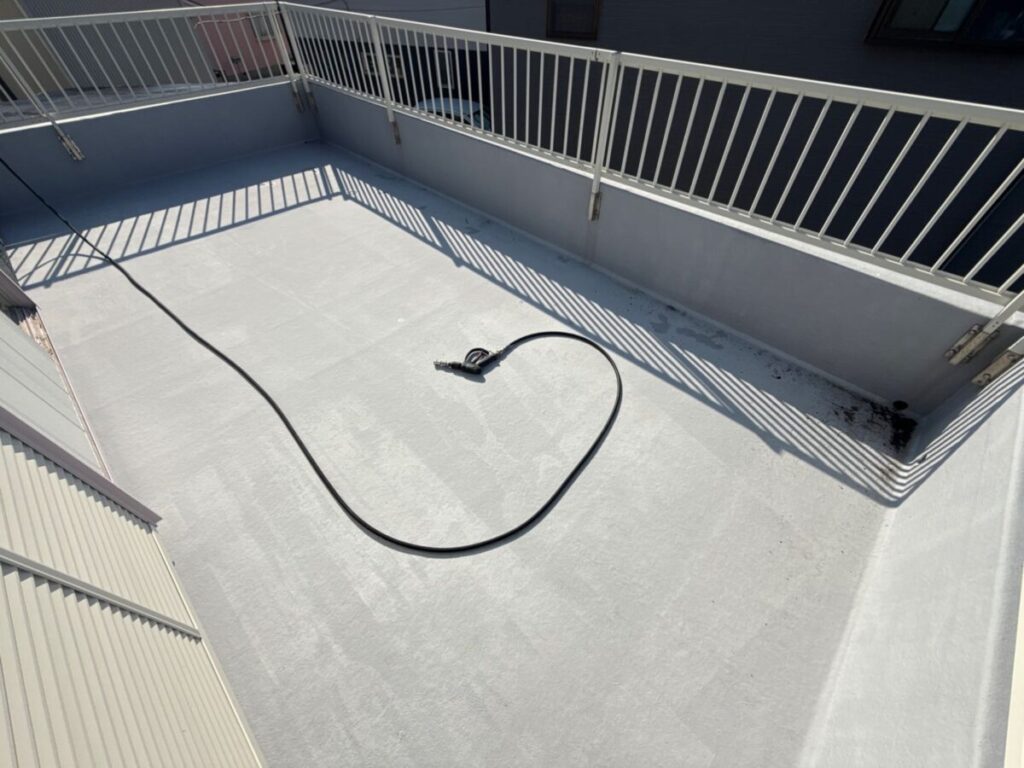 施工完了後は床面に均一な防水層が形成され、光沢のある仕上がりとなっています。これにより雨水の排水性が向上し、防水性能も大幅に回復しました。見た目も美しくなり、お客様にも大変ご満足いただけました。