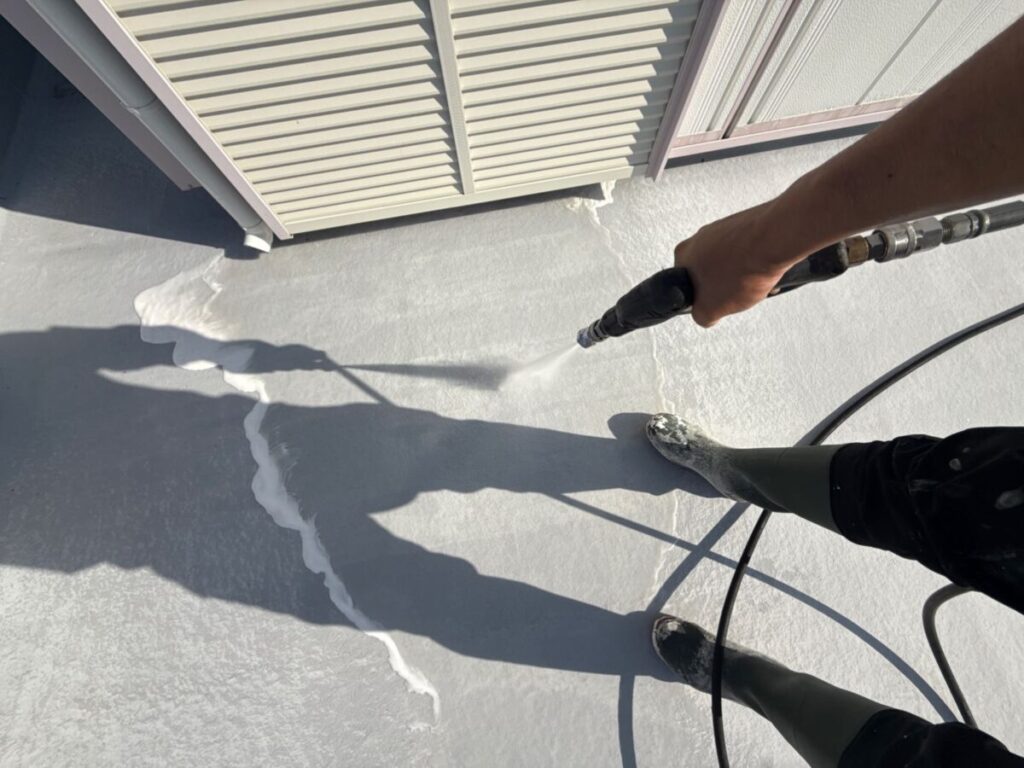 既存の防水層には経年による劣化が見られ、表面はくすんだ状態で排水口付近には汚れが溜まっていました。このまま放置すると、雨漏りや建物内部への浸水被害につながる恐れがあるため、早めのメンテナンスが必要な状況でした。