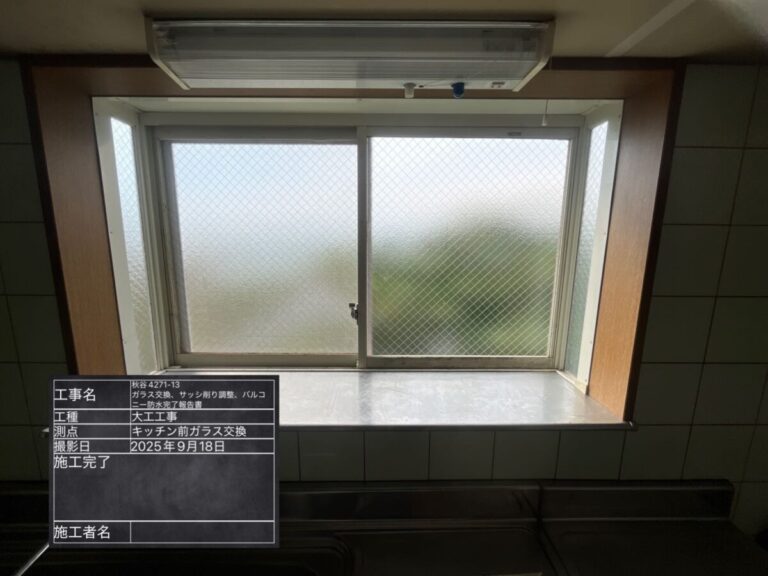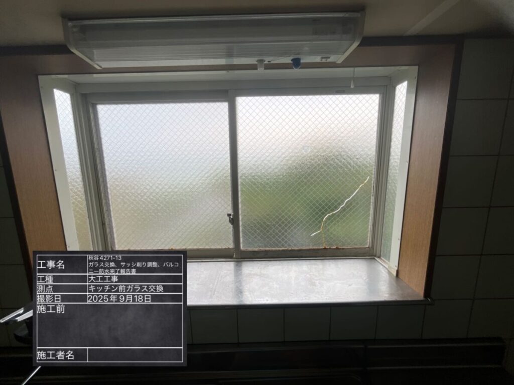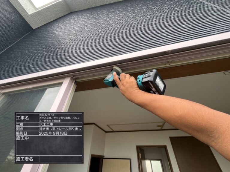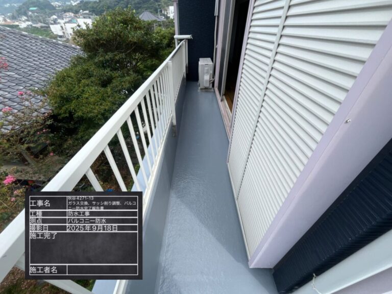 工事内容 | バルコニー防水・ガラス交換・サッシ調整・削り工事 |